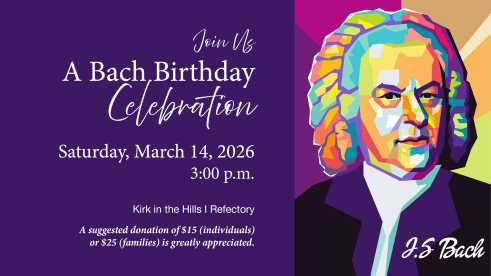 Join us on March 14th at 3:00 p.m. in the Refectory at Kirk in the Hills as we celebrate the genius of Johann Sebastian Bach with a program featuring some of his most beloved masterpieces! The concert will benefit the Kirk’s Renew and Resound campaign, with a suggested donation of $15 (individuals) or $25 (families).