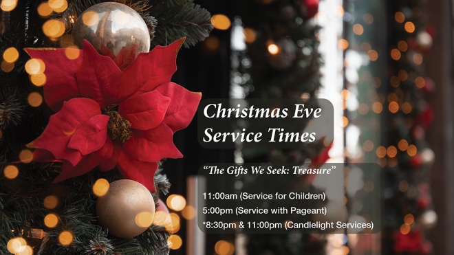 We invite you to join us for our Christmas Eve Services: “The Gifts We Seek: Treasure” 11:00am (Service for Children) 5:00pm (Service with Pageant) *8:30pm...