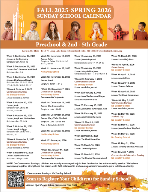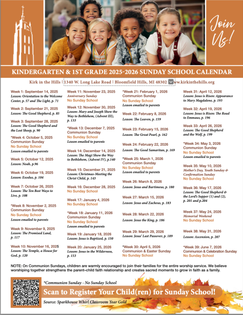 *No Sunday School on Communion Sundays, Easter Sunday (April 5, 2026), or Mother's Day, May 10, 2025.