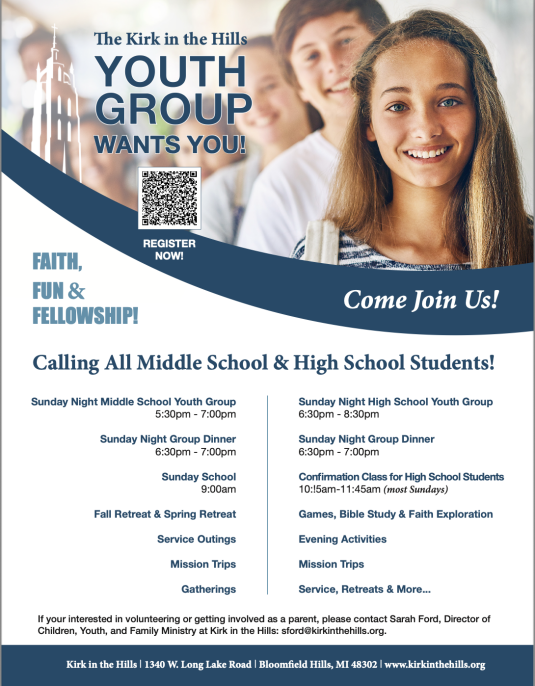 Youth ministry at Kirk in the Hills is a loving, welcoming community of faith that fosters genuine relationships, provides opportunities to explore and strengthen a relationship with God, and energizes and equips them to extend the love of Christ to the world. Humans were created for connection, so we strive to provide avenues for connection in safe and unique ways. We are a group committed to responding to God’s love through worship, study, service, and play!